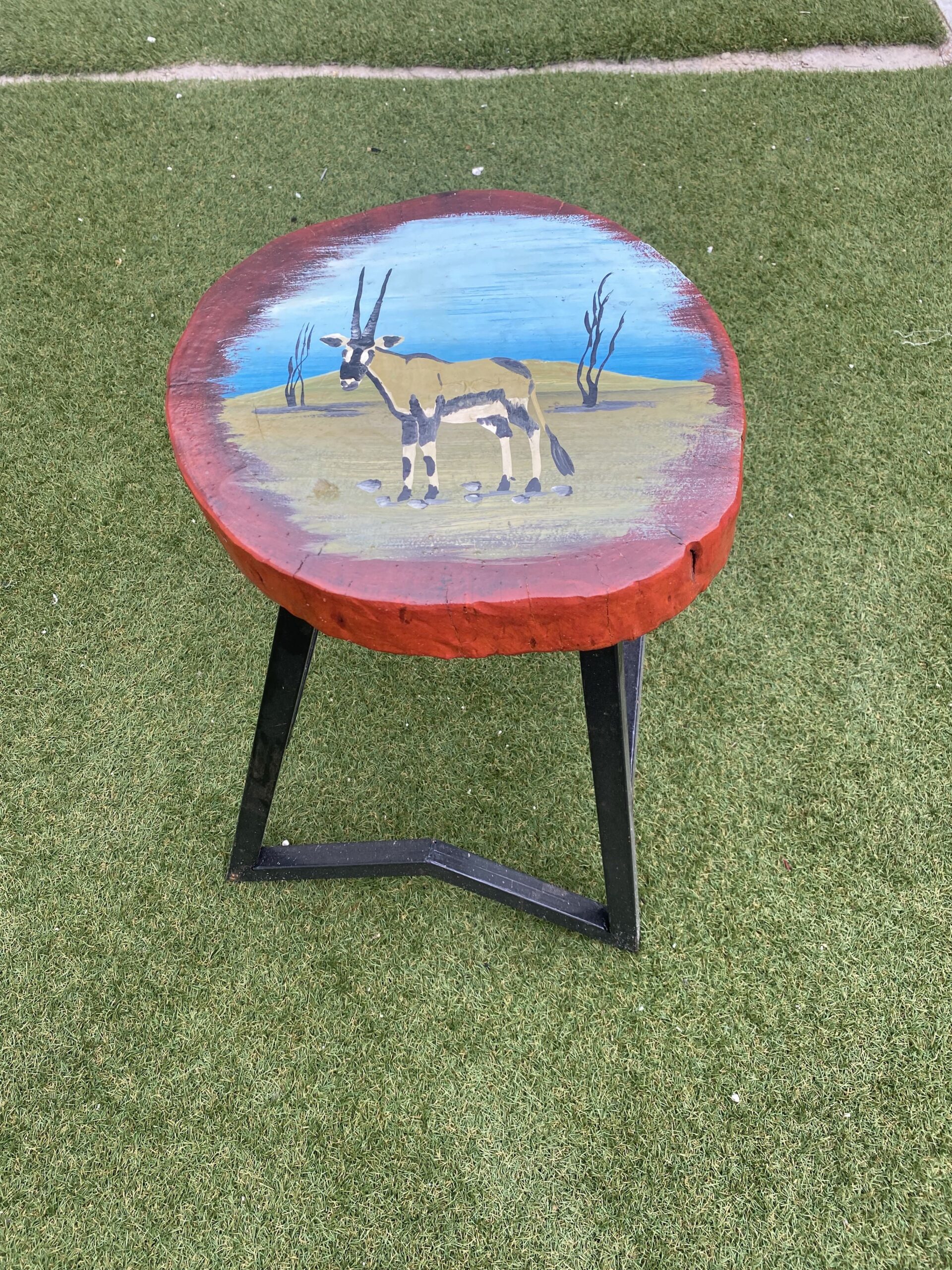 Bring nature into your space with the beautifully handcrafted Gemsbok in the Desert Stool. Featuring a solid wood seat with a vibrant hand-painted motif, this unique piece blends rustic charm with artistic elegance. Supported by sturdy metal legs, it is perfect as a stool, side table, or decorative accent for any home or café setting.