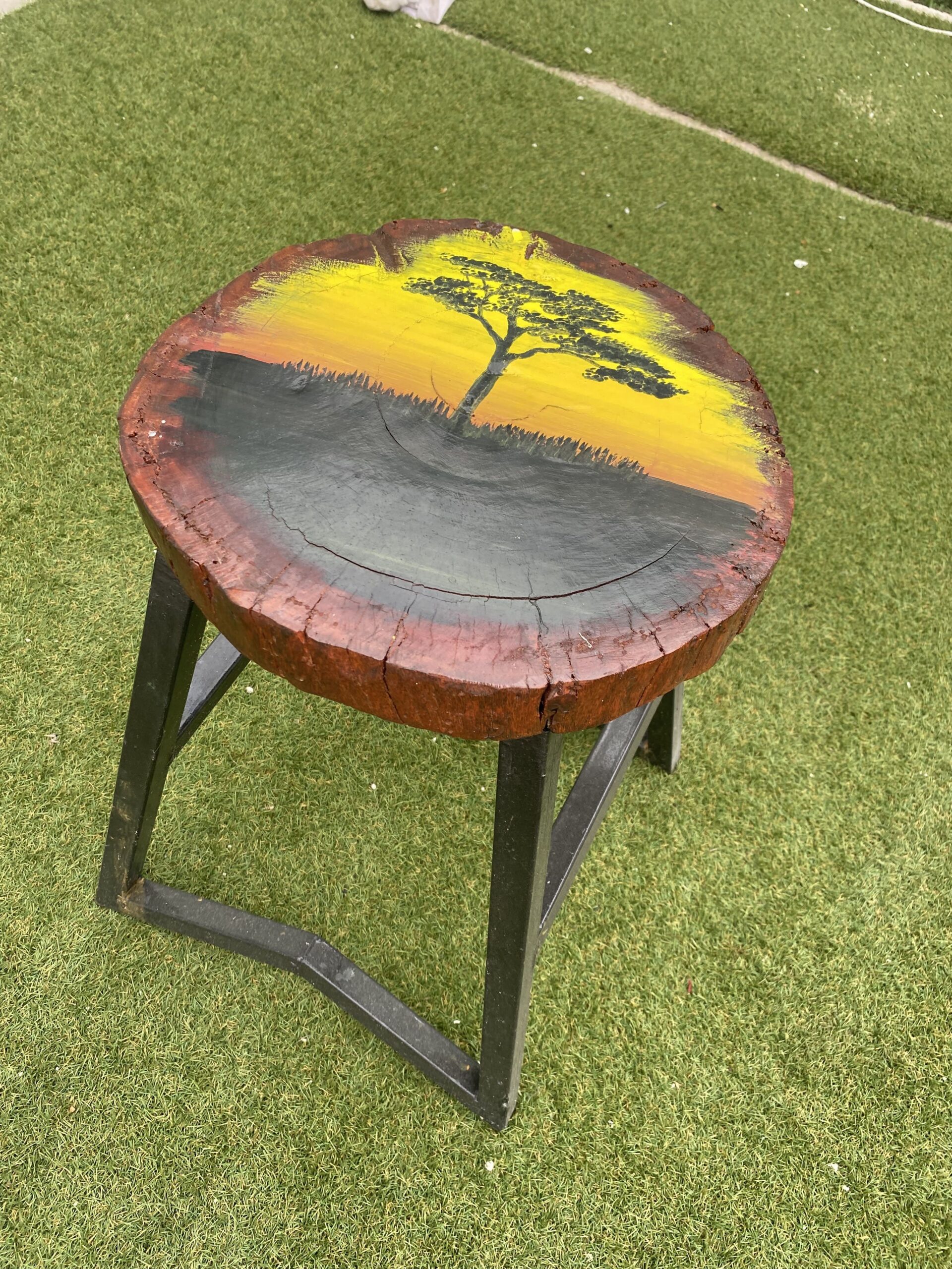 Supported by a sleek and durable metal base, the stool offers stability and versatility—ideal for use as a seat, a stylish side table, or even a decorative statement piece. Whether placed in a living room, patio, or artistic workspace, the Sunset Tree Stool is sure to be a conversation starter. Elevate your furniture collection with this timeless blend of art and functionality.